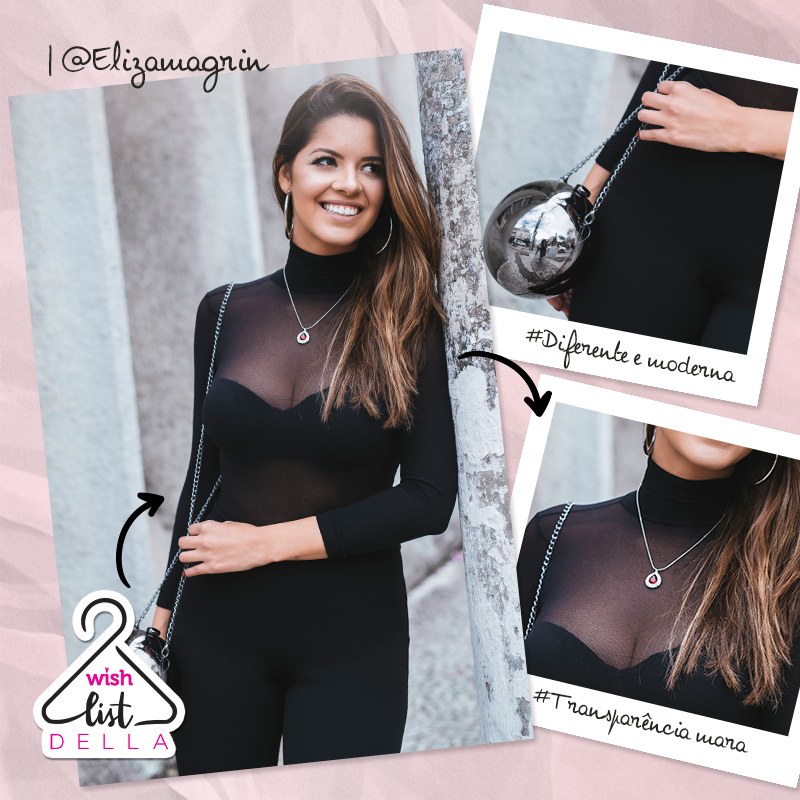 A escolha da Eliza para a Wishlist Della - Inverno 2017 dessa semana foi apostar na transparência como segunda pele, uma tendência que está super em alta e e traz toda a sensualidade e sofisticação para o seu look. Além disso, um look all black como esse pede um acessório com mais destaque, como a bolsa dourada em formato super diferente para dar aquele toque moderno na composição.