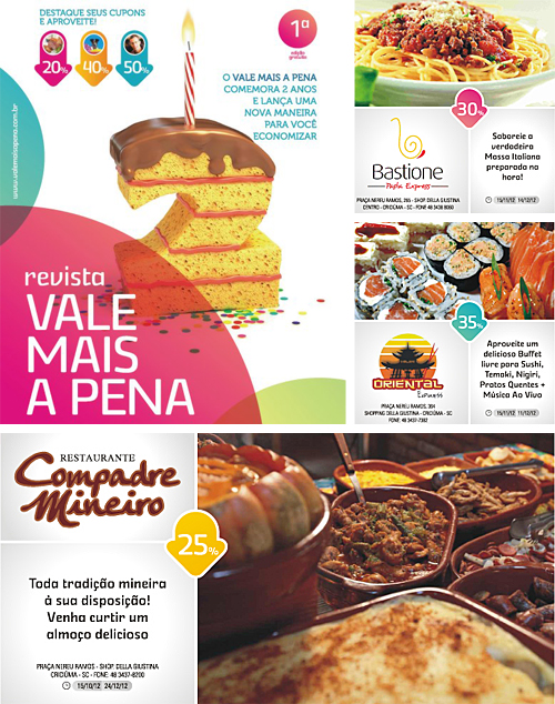O site de compra coletiva Vale Mais a Pena lançou uma revista de descontos e três lojas do Shopping Della estão presentes. Bastione, Compadre Mineiro e Oriental oferecem descontos para quem apresentar o cupom impresso na revista.