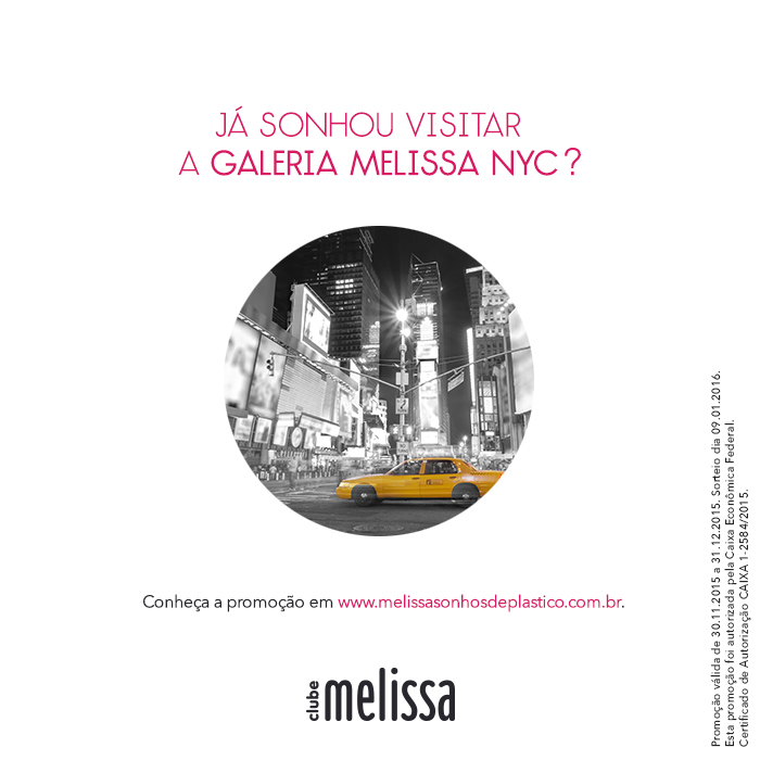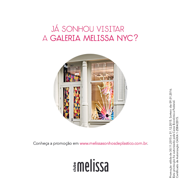 Na compra de no mínimo duas Melissas no Clube, você ganha um vale sonho para fazer seu desejo e concorrer a uma viagem com acompanhante para conhecer a galeria Melissa em NYC.