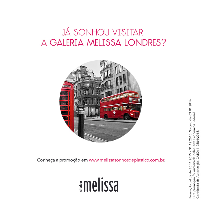 Na compra de no mínimo duas Melissas no Clube, você ganha um vale sonho para fazer seu desejo e concorrer a uma viagem com acompanhante para conhecer a galeria Melissa em Londres.