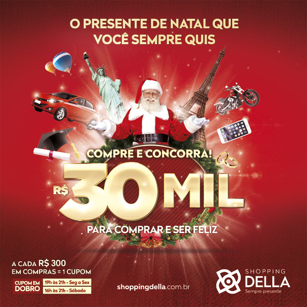 02. PERÍODO E CONDIÇÃO DE PARTICIPAÇÃO: Para participar da promoção, no período de 01/12/2015 a 30/12/2015, a cada R$ 300,00 (trezentos reais) e seus múltiplos em compras nas lojas participantes do Shopping Della, o cliente cadastrado terá direito a 01 (um) cupom para concorrer ao prêmio descrito neste regulamento através de sorteio. O cliente que efetuar sua troca de notas e/ou cupons fiscais por cupons no período da promoção de segunda a sexta das 19 às 21 horas e aos sábados das 16h às 21h, terá direito a cupons em dobro, desde que o valor das compras mais o saldo, se houver, atinja o valor mínimo exigido para recebimento de pelo menos um cupom. A troca dos cupons será efetuada no horário de funcionamento das lojas do shopping, de segunda a sábado, das 10 às 21 horas.