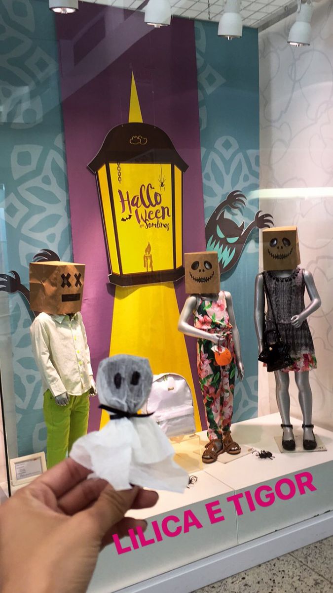 A Lilica & Tigor traz o Hallowen como tema de sua vitrine, a vitrine chama muito atenção da criançada, com looks super lindos e distribuição do pirulito fantasma, adorei!