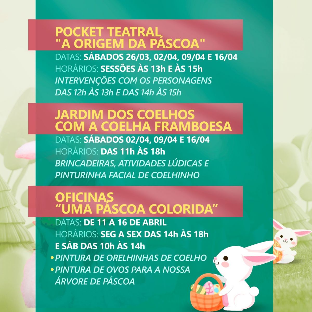 Já na praça de alimentação, no espaço Jardim dos Coelhos, a diversão fica por conta da coelha Framboesa e sua ajudante, com muitas brincadeiras, atividades lúdicas e pinturinha facial de coelhinhos para divertir a criançada!
