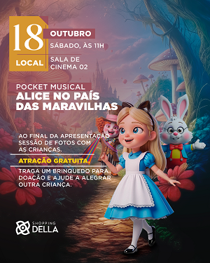 - Sábado 18/10 - 11h - Pocket Musical “Alice no País das Maravilhas” (Duração aproximada 25min)